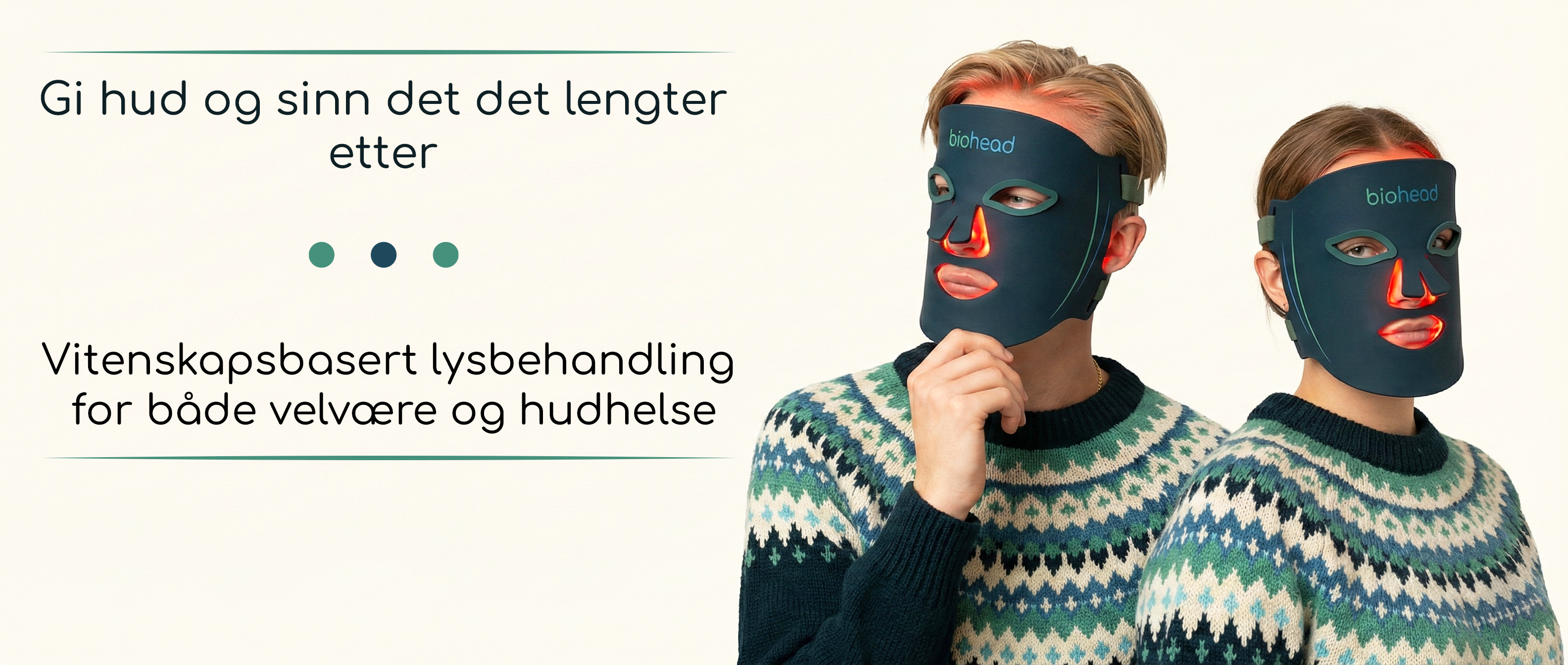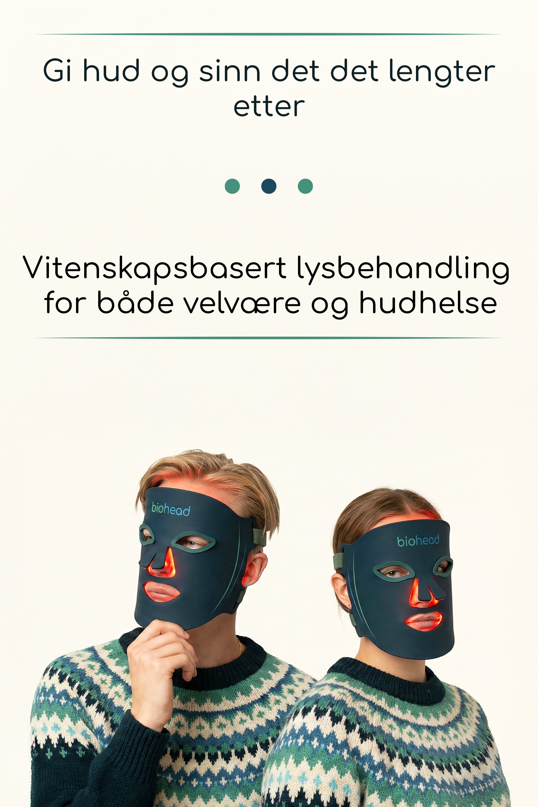 Biohead LED maske – profesjonell lysbehandling hjemme. Masken bruker fire ulike lysprogrammer i utvalgte bølgelengder basert på klinisk testede frekvenser.